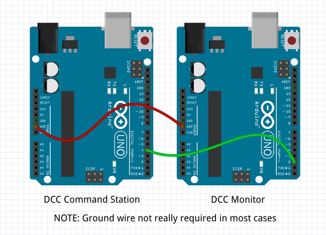 To help get around this I figured that it should be possible to simplify things by hooking two Arduinos directly together and send DCC commands from one to the other. This would at least ensure that the software was working before even having to think about the electronics.