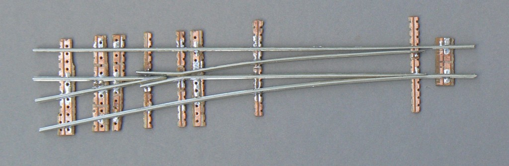 I know it looks as ugly as sin, but this is just using what I had on hand, to see how hard it is. All I used was code 80 rail from an old piece of flextrack, a file, some Veroboard, a soldering iron, and callipers to get the track spacing correct.