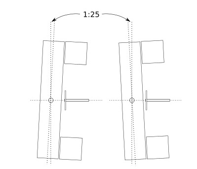 - The point angle - 1:25 may need to be modified for different frog angles. I have only made No. 6 turnouts so far and 1:25 looks about right.