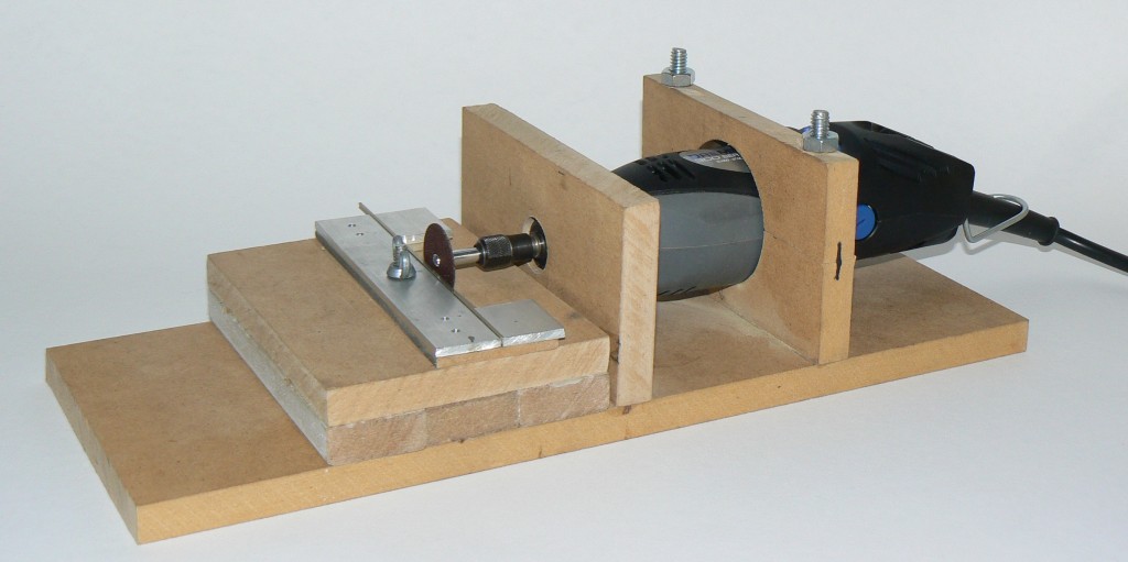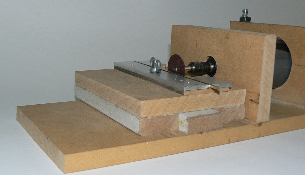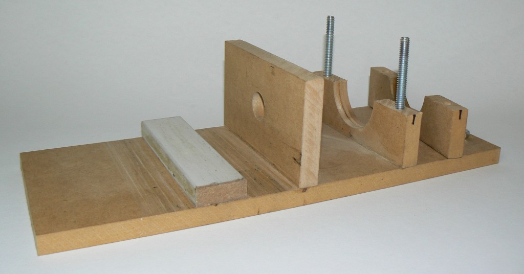 The details of this part will vary depending on the moto tool used, but I used a 300mm x 120mm piece of 12mm mdf for the base and two up-right pieces to hold the tool. A 19mm hole cut in the front piece gave me a good fit for a 300 series Dremel tool. This was drilled with a spade bit. The rear upright has a 50mm hole which is a bit large. I cut this with a hole saw. This piece was then cut in half and bolts passed through it from the base. The bolt heads were recessed into the base so that the jig sits flat. A piece of rubber was glued to the upper hole to provide a snug fit for the tool when the nuts are tightened. Calculations for the heights of these two holes above the baseboard are described below. Standard glued butt joints were used.