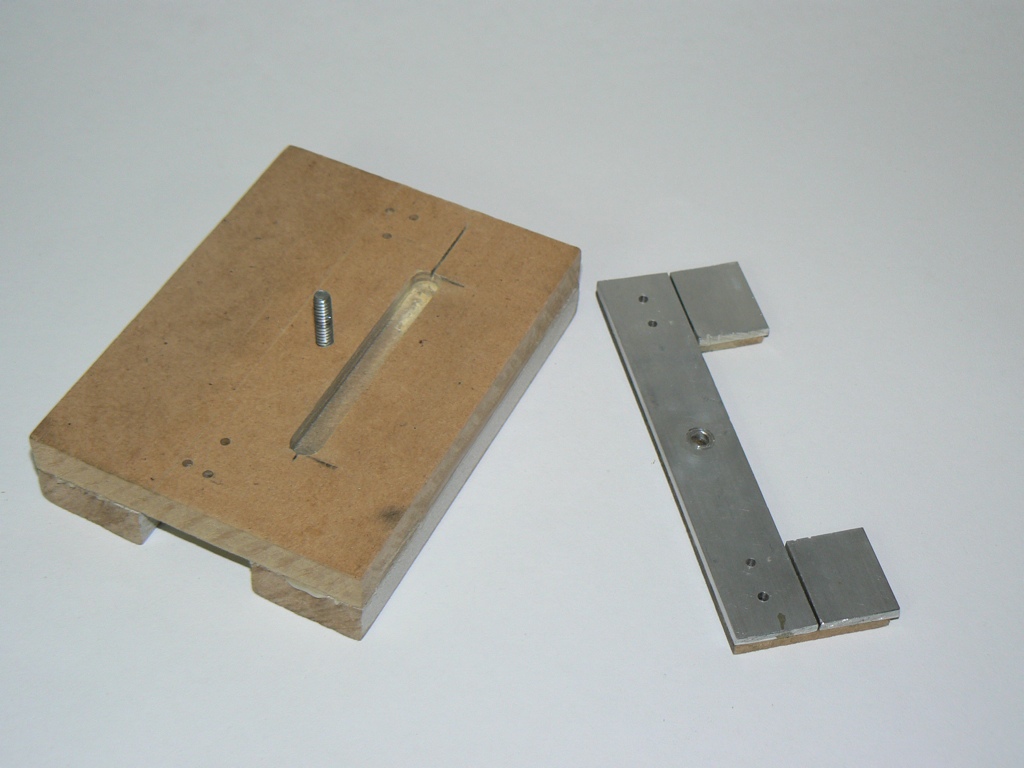 This consists of a base of 12mm mdf with 2 runners underneath that slide along the fixed piece of mdf attached to the base. These are made from 12mm x 30mm mdf. When the runners are glued to the base they are also clamped on their side tightly against a third piece acting as the slider. A shim made of a piece of paper is added to provide a small bit of clearance. After the glue has dried the slide edges that contact each other are rubbed with candle wax to allow smooth running. The top of slider base has a wide groove across it to provide clearance for the cutoff bit. This was cut with a router. On top of the base is a swiveling jig made of three strips of 3mm thick aluminum glued to a thin 3mm mdf base. These aluminium strips hold the rail tightly upside down against the cutoff tool.