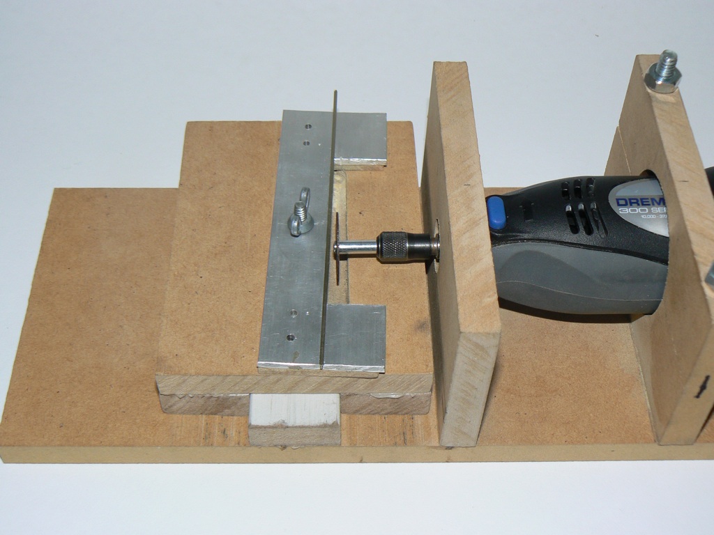 Position of Dremel Tool holes - The height of the rail holder in relation to the cutoff wheel is important. The height needs to be such that the rail top (actually the bottom as it is upside down) is just a few mm below the center of the cutoff wheel. The gives allowance for the bolt holding the cutoff wheel. The actual height needs to be calculated according to the materials used to construct the slider part of the jig, which is then used to figure out the locations of the two holes holding the moto-tool.