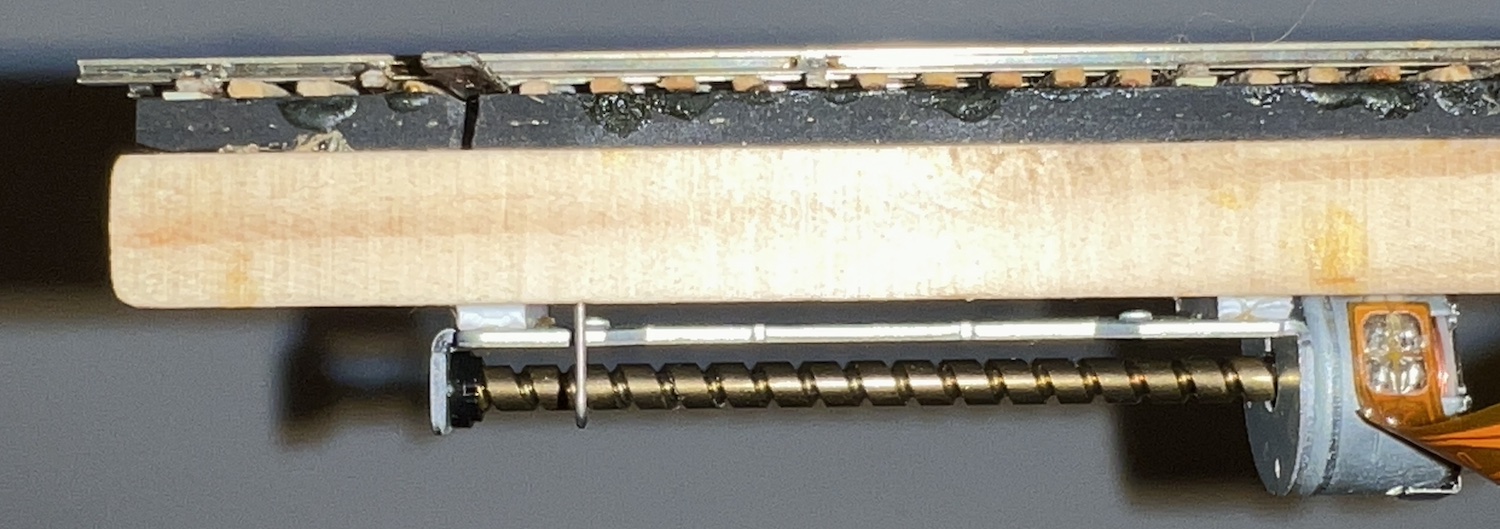 Position and glue the motor to the bottom of the turnout so that the wire is about 10mm from the motor screw. I had to use spacers to support the motor because the motor hung a bit below the base of the slider. Bend the wire again so that it rests on top of the screw with a bit of tension, which holds the wire in place. Cut the wire to length.